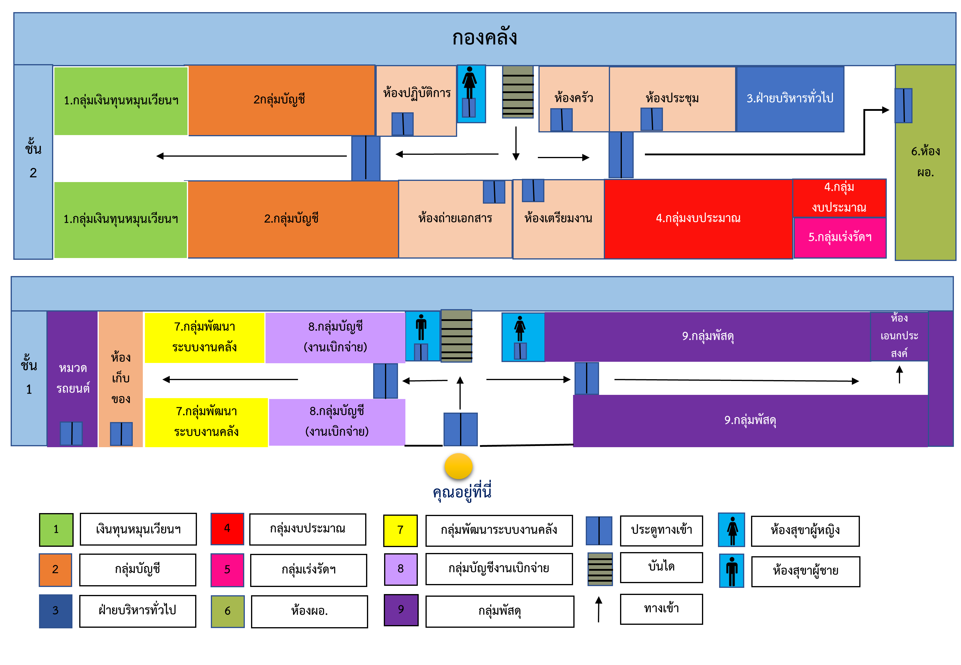 5. ฝ่ายพัสดุ มี 3 งานได้แก่ งานจัดหา งานทะเบียนและคลังพัสดุ งานอาคาร และยานพาหนะ