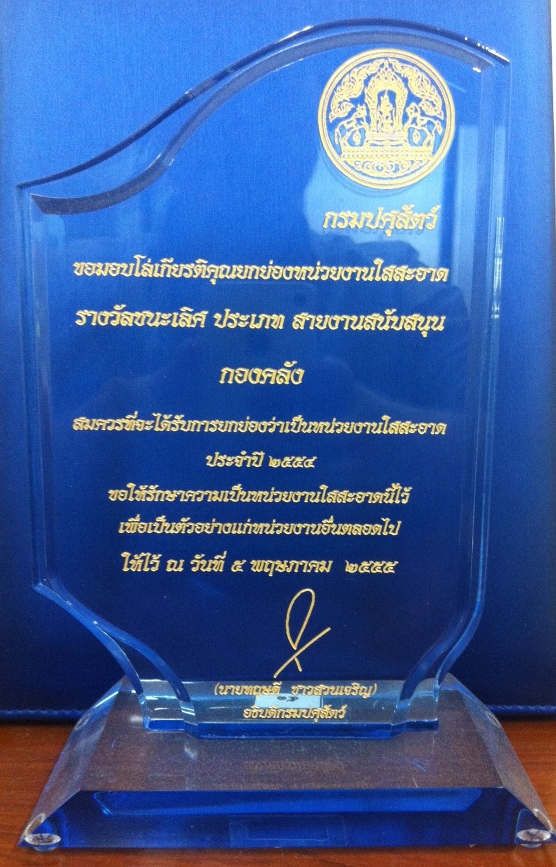 กองคลัง สมควรที่จะได้รับการยกย่องว่าเป็นหน่วยงานใสสะอาด ประจำปี พ.ศ.2554