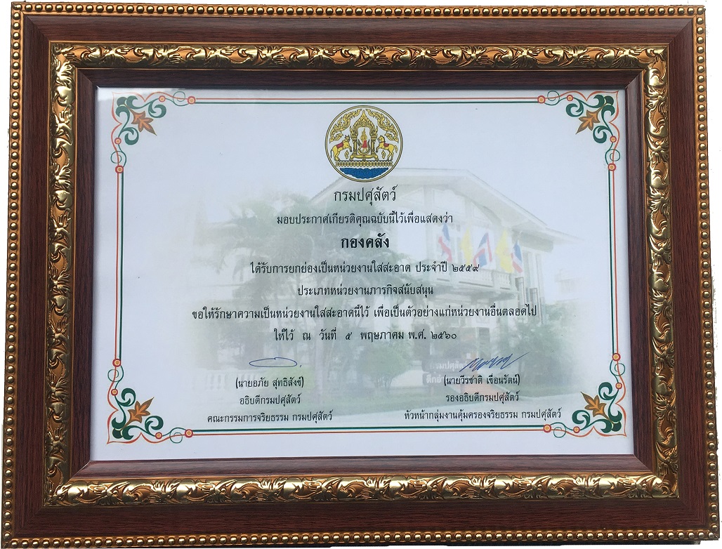 ได้รับการยกย่องเป็นหน่วยงานใส่สะอาด ประจำปี 2559 ประเภทหน่วยงานภารกิจสนับสนุน