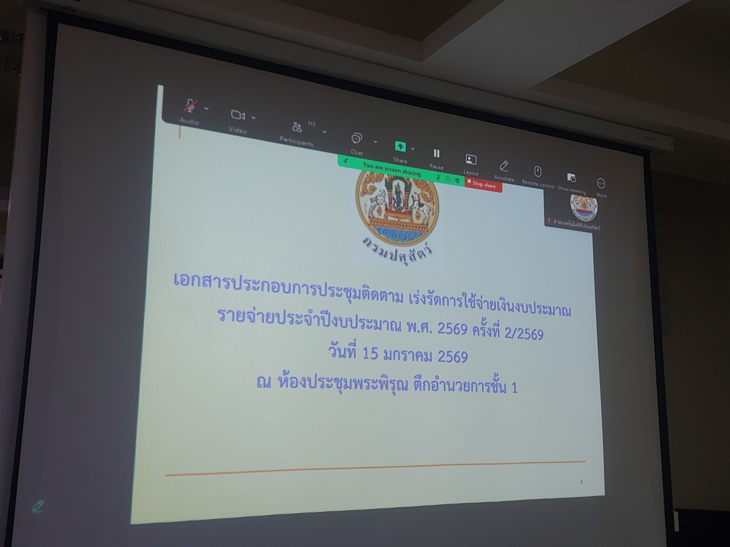 นายวีระสันติ ประทุมพล ผู้อำนวยการสำนักพัฒนาอาหารสัตว์ นายจิรภัทร อินทร์สุข เลขานุการกรม นายชุติพนธ์ ศิริมงคลรัตน์ ผู้อำนวยการกองสารวัตรและกักกัน นางสุดารัตน์ เจือจันทร์ ผู้อำนวยการกองควบคุมอาหารและยาสัตว์ นางสาวธารารัตน์ มูลิกา นักวิชาการตรวจสอบภายในชำนาญการพิเศษ รักษาการในตำแหน่งผู้เชี่ยวชาญด้านตรวจสอบภายใน และเจ้าหน้าที่ที่เกี่ยวข้อง เข้าร่วมการประชุมในครั้งนี้ ผ่านระบบ ZOOM meeting ออนไลน์ เพื่อเร่งรัดติดตามการใช้จ่ายเงินงบประมาณรายจ่าย ประจำปีงบประมาณ พ.ศ. 2569 ของกรมปศุสัตว์ให้เป็นไปตามเป้าหมายที่คณะกรรมการติดตามเร่งรัดการเบิกจ่ายงบประมาณ และการใช้จ่ายภาครัฐกำหนด