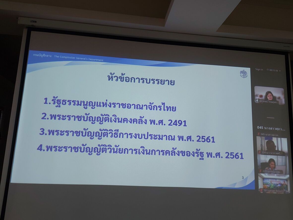 วันที่ 25 กุมภาพันธ์ 2569 เจ้าหน้าที่กองคลัง ได้เข้าร่วมโครงการอบรมหลักสูตร “กฎหมายการคลังที่ผู้ปฏิบัติงานต้องรู้”(ตอน กม.วินัยการเงินการคลัง กม.ว่าด้วยงบประมาณ เงินนอกงบประมาณ ระเบียบเบิกจ่ายเงินจากคลังและความรับผิดทางละเมิดของเจ้าหน้าที่) ผ่านระบบ (Zoom Meeting) ออนไลน์