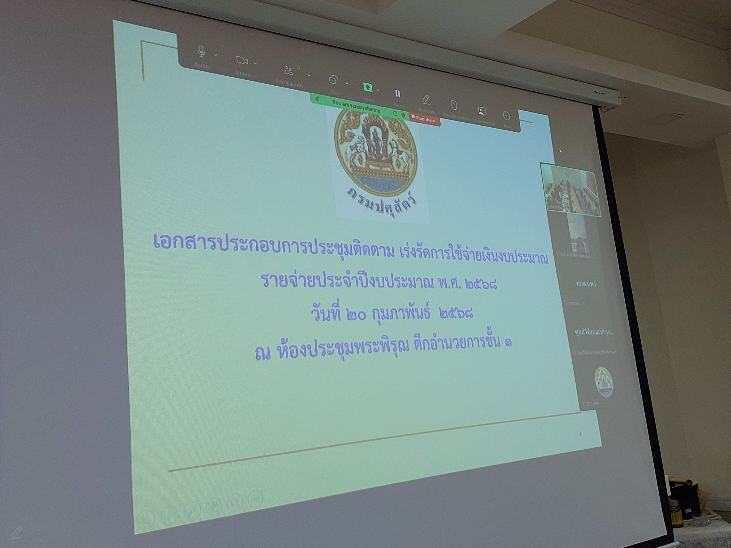 วันที่ 20 กุมภาพันธ์ 2568 เวลา 09.30น. นายพงษ์พันธ์ ธรรมมา รองอธิบดีกรมปศุสัตว์ เป็นประธานในการประชุมติดตาม เร่งรัดการใช้จ่ายเงินงบประมาณรายจ่ายประจำปีงบประมาณ พ.ศ.2568 (ผ่านระบบทางไกล Zoom Conference) ครั้งที่ 2/2568 ณ ห้องประชุมพระพิรุณ กรมปศุสัตว์ โดยมี นางสาวจุไรรักษ์ อุนาภีร์ ผู้อำนวยการกองคลัง น.สพ. เชาวฤทธิ์ บุญมาทิต ผู้อำนวยการกองแผนงาน และเจ้าหน้าที่ที่เกี่ยวข้องเข้าร่วมการประชุมในครั้งนี้ เพื่อให้การใช้จ่ายเงินงบประมาณรายจ่าย ประจำปี พ.ศ.2568 บรรลุเป้าหมายและมีประสิทธิภาพมากยิ่งขึ้้น โดยเฉพาะรายจ่ายลงทุนที่จะต้องเร่งรัดดำเนินการจัดซื้อจัดจ้าง/ก่อหนี้ ผูกพันให้แล้วเสร็จภายในไตรมาสที่ 1 และเบิกจ่ายให้แล้วเสร็จภายในปีงบประมาณ พ.ศ.2568 ให้สามารถเบิกจ่ายงบประมาณดังกล่าว ภายในไตรมาสที่ 2 ของปีงบประมาณ พ.ศ.2568