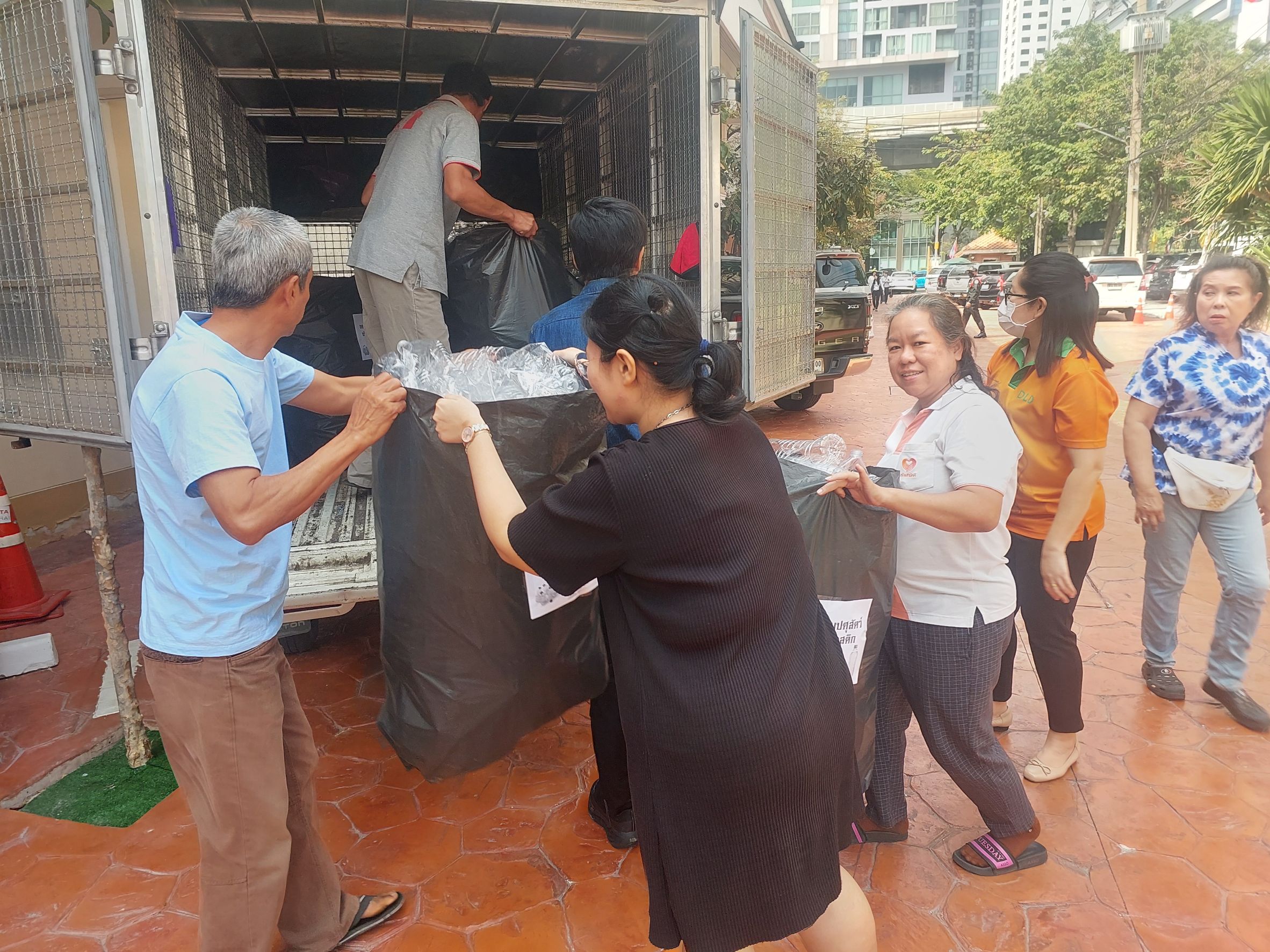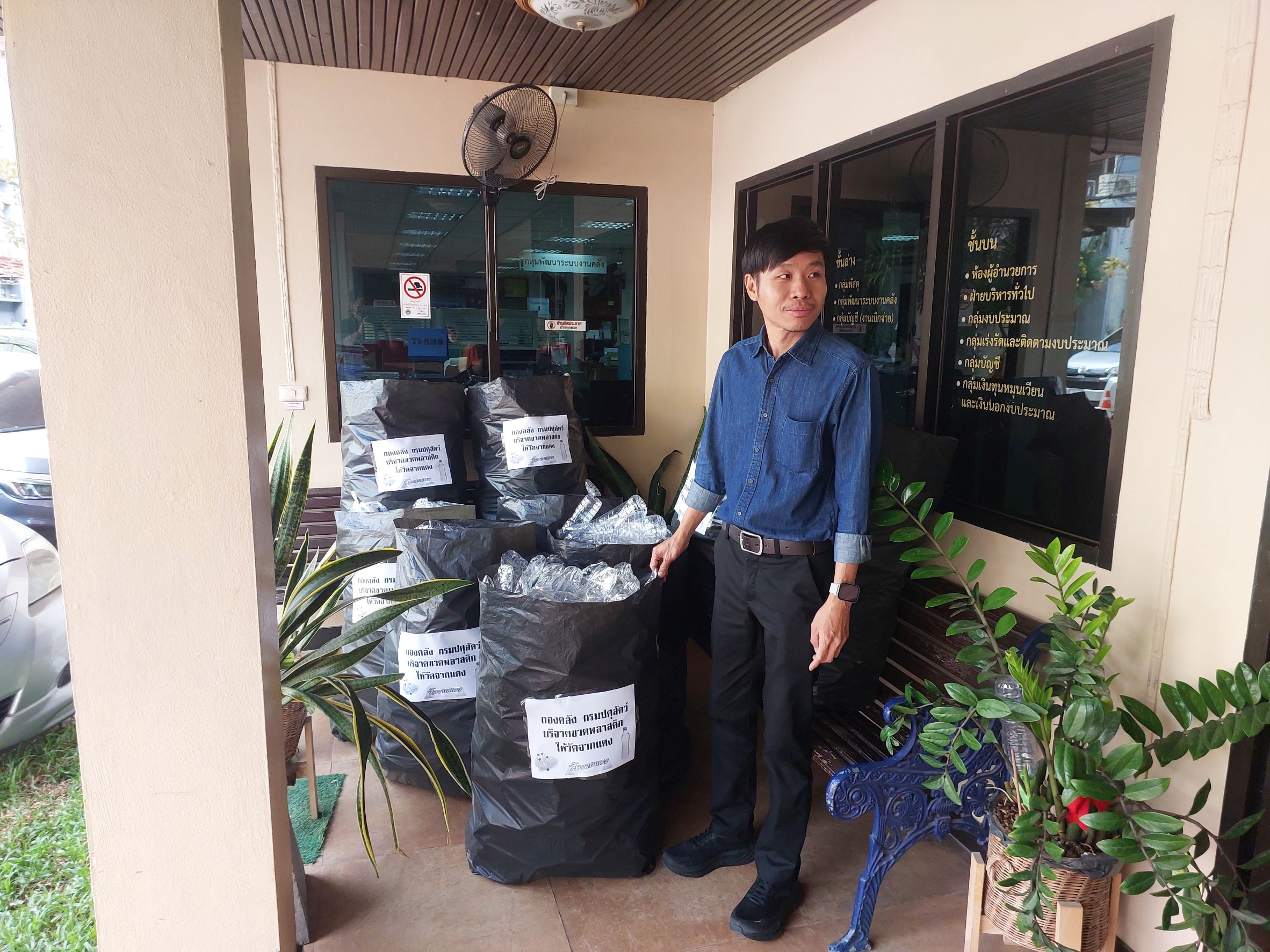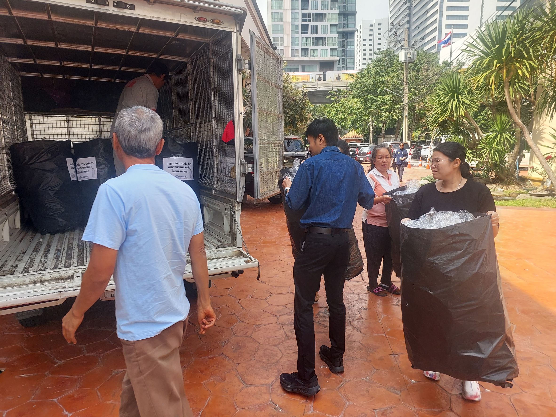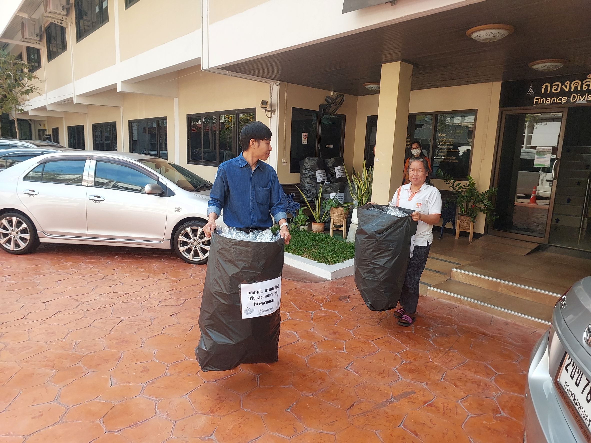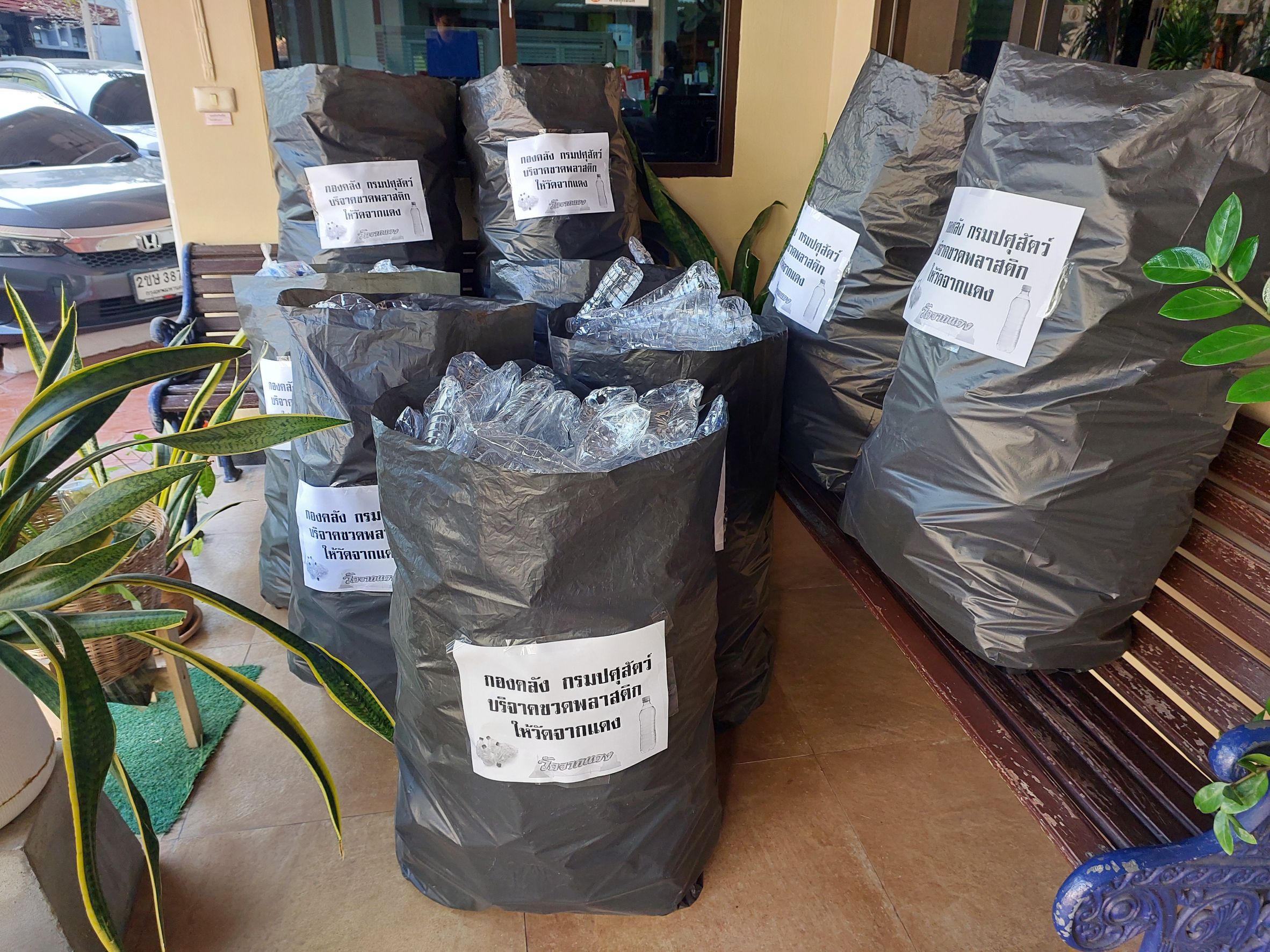 กองคลังร่วมบริจาคขวดน้ำพลาสติกให้วัดจากแดง เพื่อนำขวดไปรีไซเคิลเป็นผ้าไตรจีวร