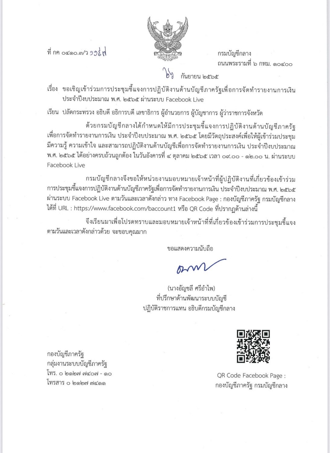 ขอเชิญเข้าร่วมการประชุมชี้แจงการปฏิบัติงานด้านบัญชีภาครัฐเพื่อการจัดทำรายงานการเงินประจำปีงบประมาณ พ.ศ. 2565 ผ่านระบบ Facebook Live |